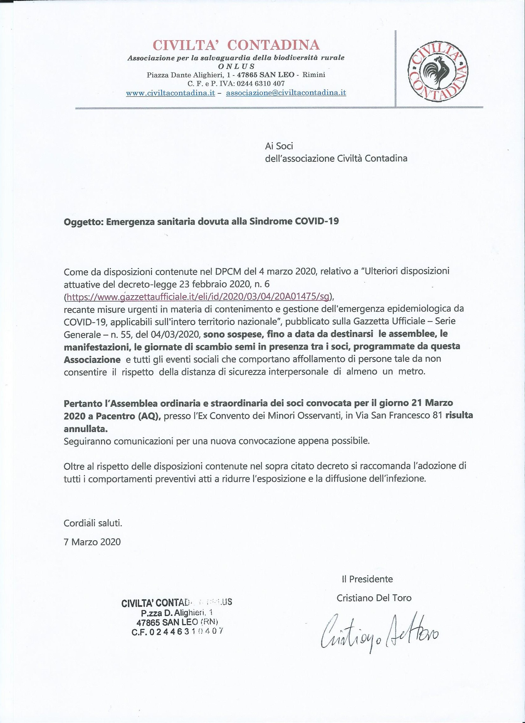 Comunichiamo che, come da disposizioni contenute nel DPCM del 4 marzo 2020, sono sospese fino a data da destinarsi, le assemblee, le manifestazioni, le giornate di scambio semi in presenza tra i soci, programmate da questa Associazione.