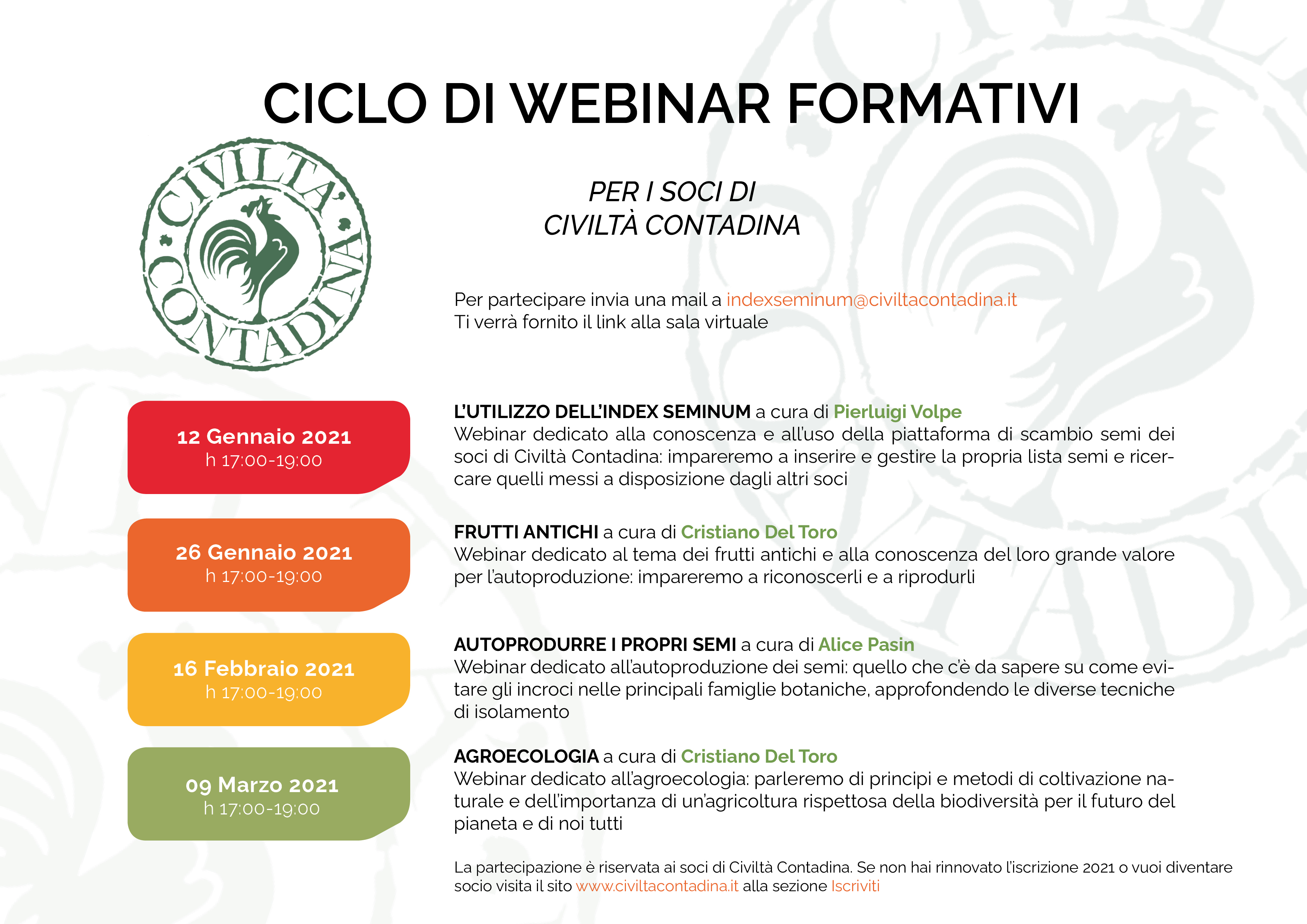 Parte il primo ciclo di webinar formativi di Civiltà Contadina sui temi legati alle nostre azioni. Parleremo di autoproduzione dei semi, frutti antichi, agroecologia. Il primo webinar sarà dedicato all'uso dell'Index seminum, strumento riservato ai soci per gestire la propria lista semi e condividere i propri semi tra loro.