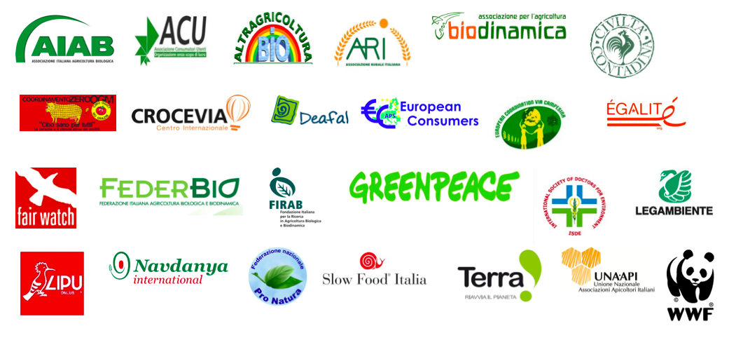 Acu; Aiab; Altragricoltura Bio; Ari; Ass. Agr. Biodinamica; Civiltà Contadina; Coord. Zero OGM; Crocevia; Deafal; Égalité; European Consumers; European Coordination Via Campesina; Fair Watch; FederBio; Firab; Greenpeace; Isde; Legambiente; Lipu; Navdanya; Pro Natura; Slow Food; Terra!; Unaapi; Wwf.